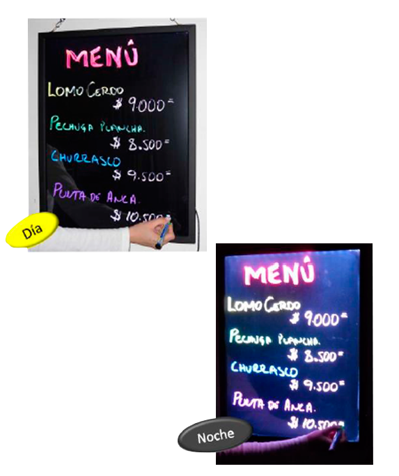 Presentamos la última tecnología en publicidad para tu negocio, con la cuál tu capacidad de persuasión será limitada. Es un pizarrón borrable, en él escribes, dibujas y/o diseñas tu mensaje y la tecnología LED hará que brille y cambie de color de una manera llamativa e impactante. Esta tecnología es ideal para publicitar especialidades del día, bebidas y/o combos especiales, próximos eventos o promociones; perfecta para atraer nuevos clientes a tu negocio y/o para influenciarlos de tal manera que decidan sobre productos especialmente enfocados a tus perspectivas de venta.